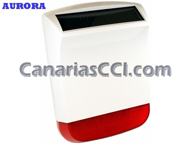 Sirena exterior totalmente inalámbrica para alarmas Aurora Light G3 y Aurora Touch G5 de nivel sonoro de 120 decibelios con alimentación mediante su mini panel solar integrado y 2 baterías de litio recargables, cuenta con luz estrobosco?pica y protección antisabotaje. No necesita corriente eléctrica.
