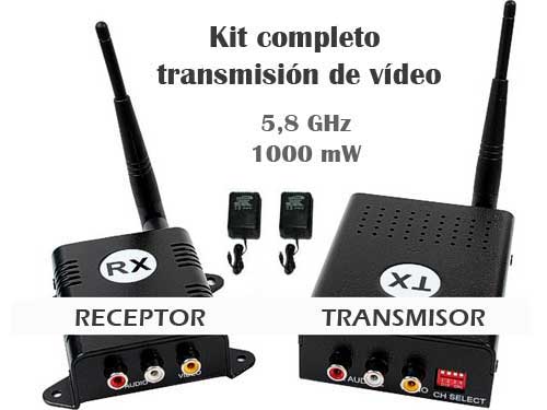 El kit completo para la transmisión inalámbrica de audio y vídeo a 5,8 GHz / 1000 mW está compuesto por 1 transmisor, 1 receptor, 2 antenas, 2 alimentadores, y 2 cables A/V. El kit emite en la frecuencia de 5,8 GHz (5725-5875 MHz) enviando las señales de audio en estéreo y vídeo de gran calidad. La frecuencia de 5,8 GHz es menos utilizada en comparación con la de 2,4 GHz y por este motivo se considera más segura y cómoda.